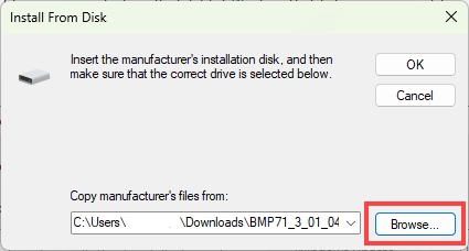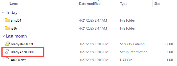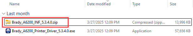 Most Brady printer drivers come packaged as .exe files. This allows manually installing the device driver through Device Manager. The .inf file can be used to manually install the driver.