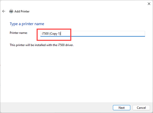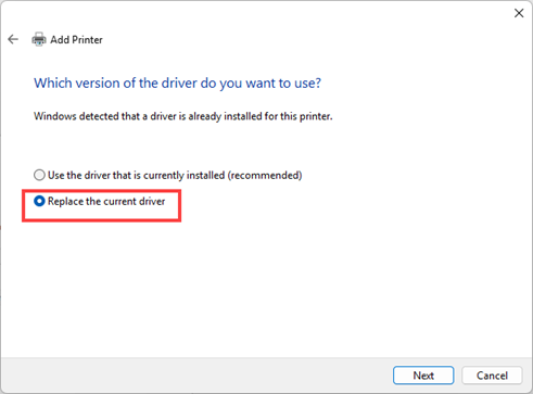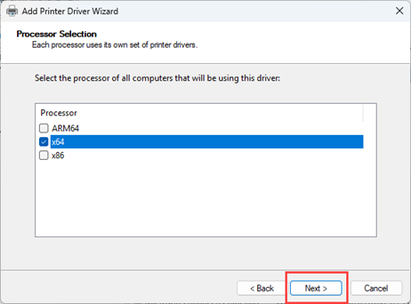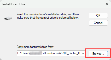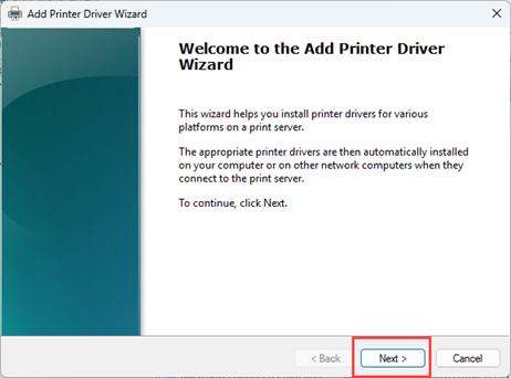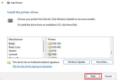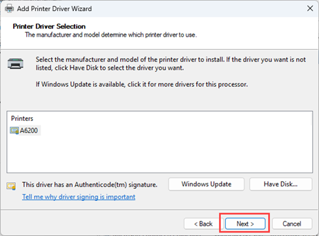 Navigate to the driver folder that includes the .inf file and select Next. This will install the driver for the printer.