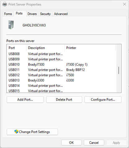 If the driver has the Brady Driver screen, in Devices and Printers, click Printers & Scanners < Print server properties < Ports tab to verify this information.