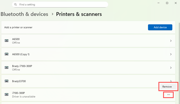 - If there are three dots next to the printer name, click the three dots and click Remove.
