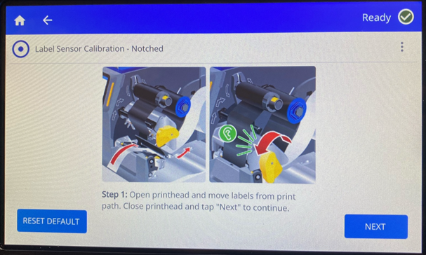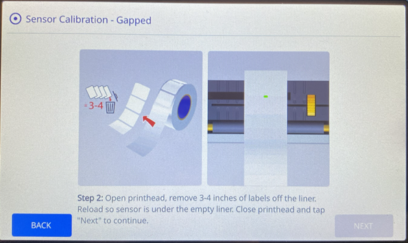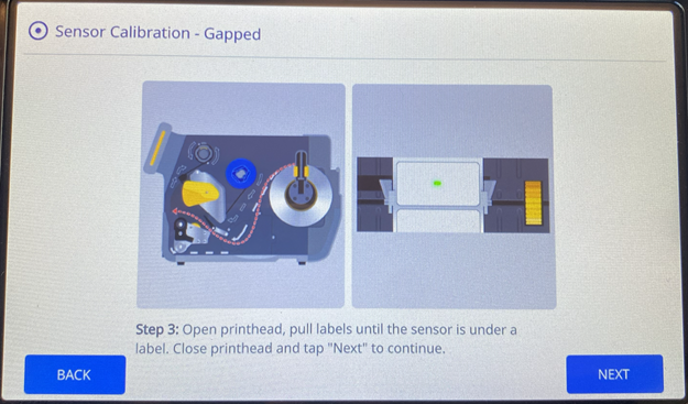 - Open the printhead and pull labels so the sensor is under a label. Close the printhead and tap Next.