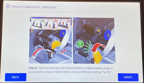 - Open the printhead and reload the label. Close then printhead and tap Verify.