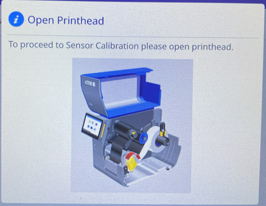 - Depending on how the sensor calibration is started, there may be an initial screen to open the printhead. If this screen does not appear, proceed to the next step.